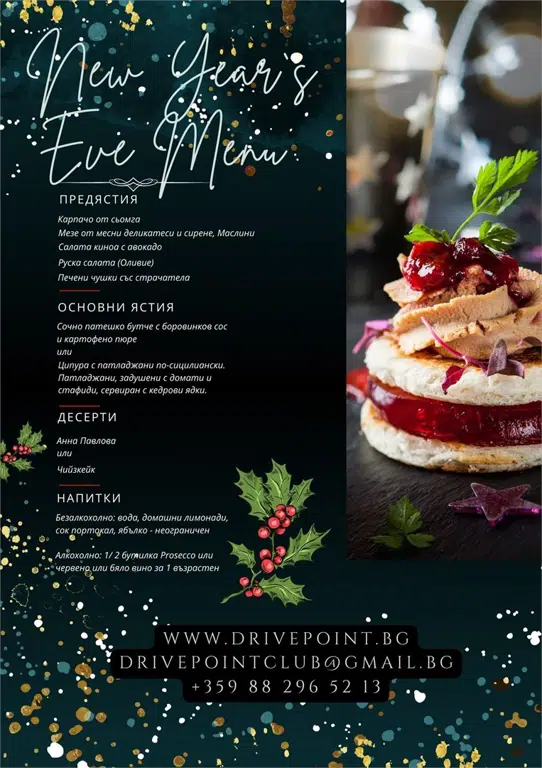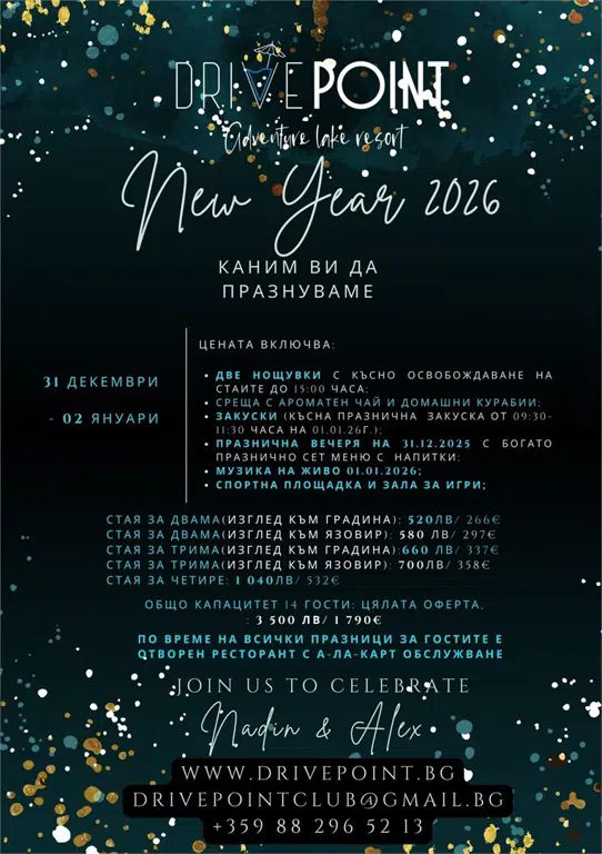 20:00 - празнична вечеря на 31.12.2025 с богато празнично сет меню с напитки;